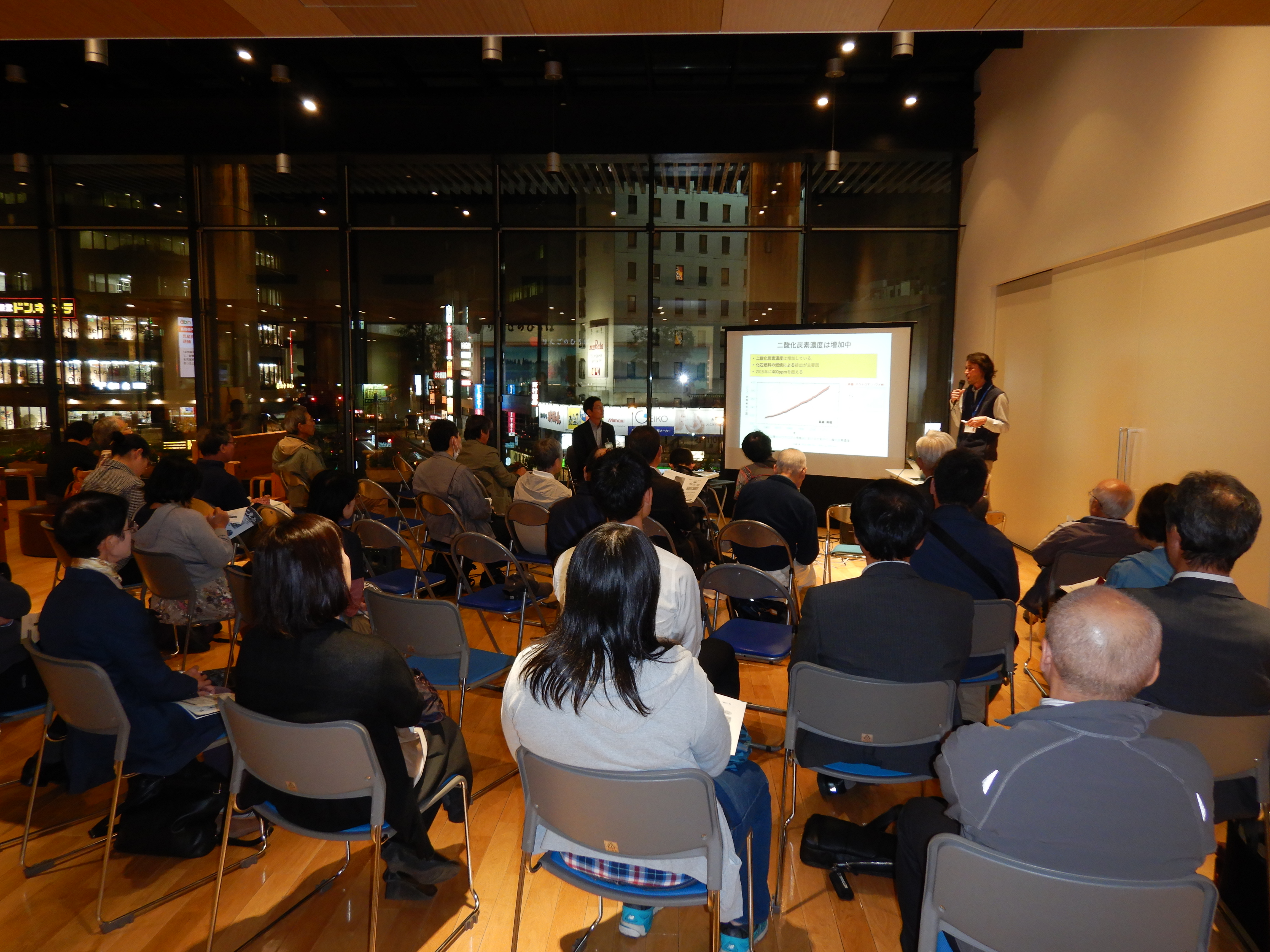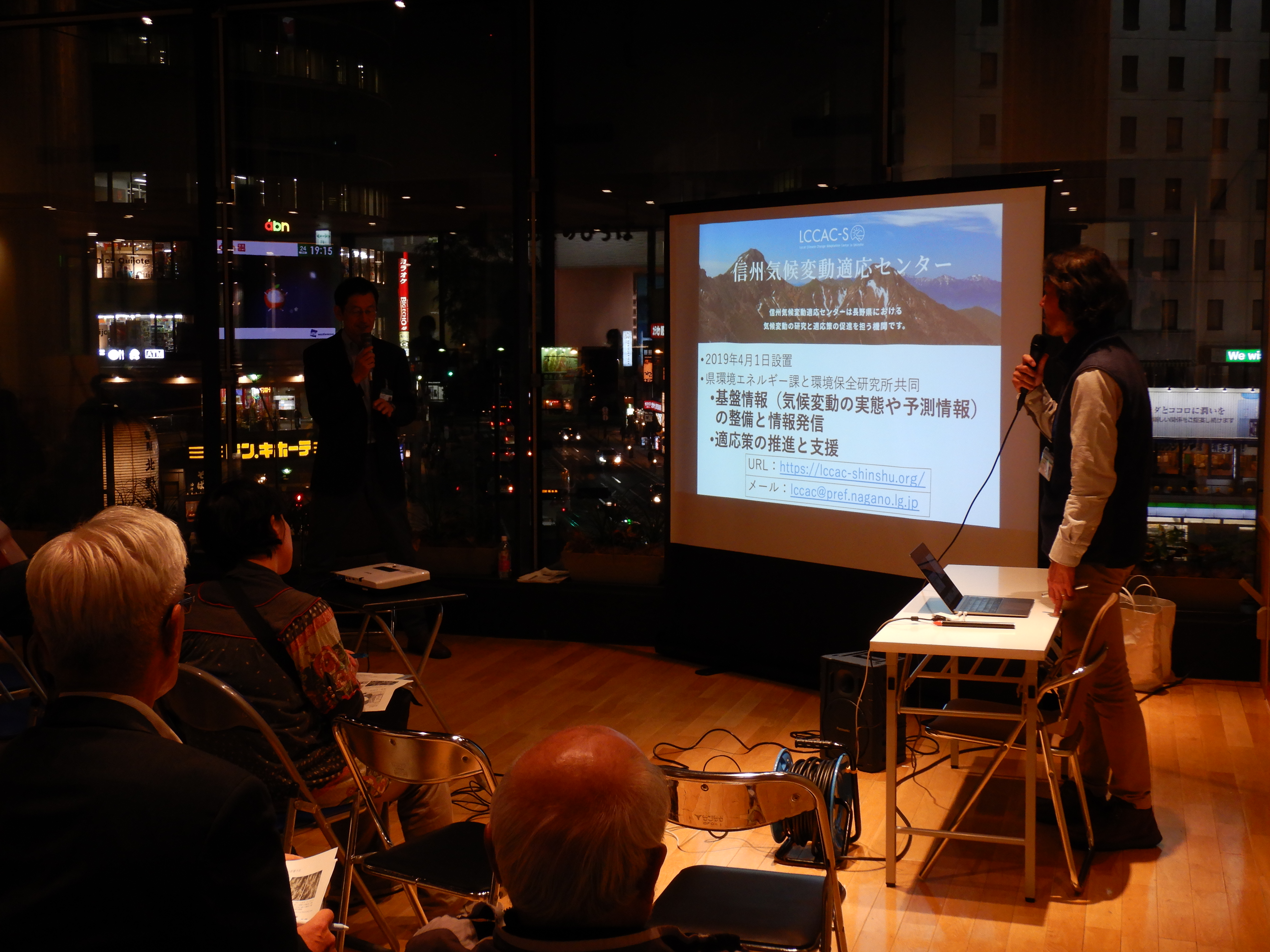 普段の「山と自然のサイエンスカフェ@信州」は、その名のとおり「科学」の視点から、信州の大きな特色と魅力の源である“山と自然”に関する話題を提供し、参加者のみなさまとともに気軽に語り合うイベントですが、今回は平成31年4月1日の「信州気候変動適応センター」の設置を受け、テーマを変更し、気候変動について、「何が起きているのか」「どう備えていくか」を紹介し、皆様にも考えていただく回としました。